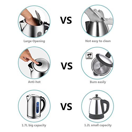 Il bollitore elettrico in acciaio Aigostar King 30CEA ha una capacità massima di acqua di 1,7 litri. Si tratta di una capacità di valore medio, 1,7 litri di acqua è infatti il quantitativo di acqua adatto a diverse esigenze; è una quantità giusta sia per preparare con praticità un buon tè o una tisana, oppure utilizzare l’intera capienza della caraffa per utilizzare l’acqua calda in varie preparazioni in cucina.
